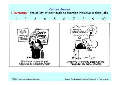 The 0 to 10 Relationship Management Culture Survey illustrations are very powerful catalysts for enabling people to have a conversation that matters. If you were interested to know what your team members thought about the level of autonomy that they had in their jobs, you could place the illustration below on the table and ask them to mark on the scale where they believe the level currently sits.